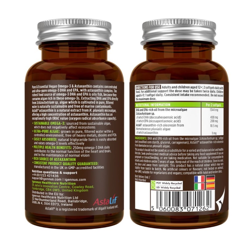 Preparat zawiera wysoką dawkę kwasów omega-3 pochodzenia roślinnego (z alg, DHA i EPA) oraz astaksantynę. Dzięki temu w jednej kapsułce dostarczamy sobie kombinację substancji podobnych takich, jak te, które w naturze występują w dziko żyjących łososiach czy krewetkach. Dlatego preparat ten jest odpowiedni nie tylko dla wegan i osób szukających alternatywnego dla oleju z ryb źródła kwasów omega-3 ale również dla osób pragnących połączyć suplementację kwasami omega-3.