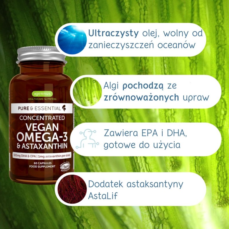 Naturalne wegańskie kwasy omega-3 z alg plus astaksantyna AstaLif z mikroalg Haematococcus pluvialis