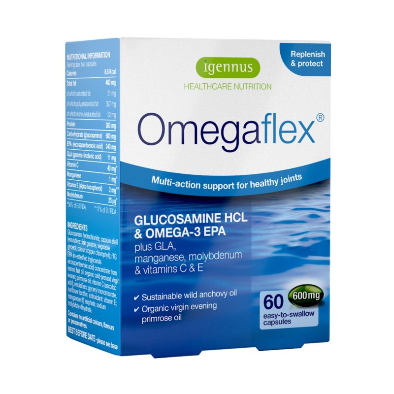 Omegaflex łączy działanie glukozaminy i EPA (omega-3), tłoczonego na zimno oleju z wiesiołka a także molibdenu oraz witamin C i E.