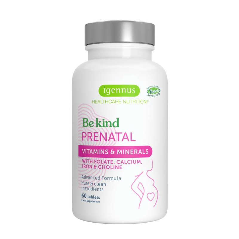 PRENATAL to pierwszy z preparatów serii Be kind (Bądź miły/a). Zawiera aktywne witaminy i minerały, w tym folian, wapń i żelazo a także cholinę. Skład preparatu został opracowany przez specjalistów tak, by kompleksowo uzupełniać codzienną dietę kobiet w ciąży i matek karmiących, zwłaszcza w 3 pierwszych miesiącach życia dziecka. Zawiera składniki niezbędne zarówno dla matki, jak i dla dziecka. Formy składników preparatu Prenatal są w pełni bezpieczne i biodostępne, a zastosowane dawki dobrane tak, by nie przyczyniać się do ich nadmiaru oraz, by składniki współdziałały z sobą.